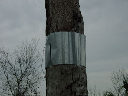 Tree-bandingIn some cases, a wide metal band is attached around the trunk of a tree that holds a bird nest. This prevents some predators, such as raccoons, from climbing the tree and stealing the eggs. For example, this may be done for trees with ospreys, eagles, or great horned owls. |